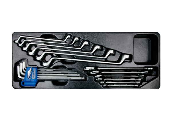 ZESTAW 21cz.- KLUCZE PŁASKIE 6cz. 6-24mm, KLUCZE OCZKOWE ODGIĘTE 75* 6cz. 8-19mm, IMBUSY 9 szt.1120 HEX Z KULKĄ,WKŁAD DO SKRZYNK