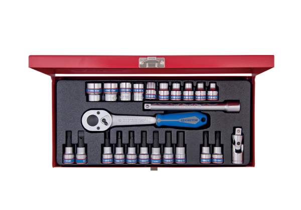 ZESTAW NARZĘDZI 3/8" 24cz. NASADKI KRÓTKIE 12-kąt. 6 - 22mm, HEX 3 - 10, KRZYŻ. 2,3 PŁASKIE 5, 8 Z GRZECHOTKĄ I AKCESORIAMI, KAS