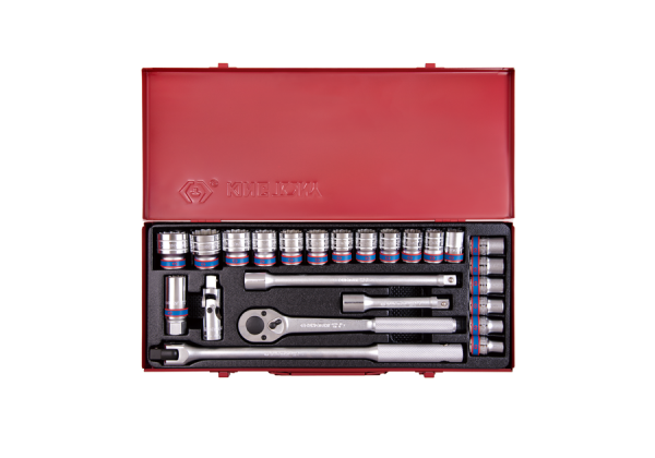 ZESTAW NASADEK 1/2" 24cz. KRÓTKIE 6-kąt. 10 - 32mm Z GRZECHOTKĄ I AKCESORIAMI, KASETA
