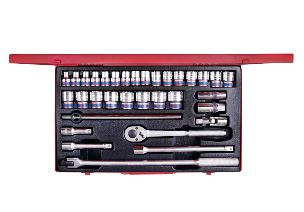 ZESTAW NASADEK 1/2" 33cz. KRÓTKIE 12-kąt. 8 - 32mm Z GRZECHOTKĄ I AKCESORIAMI, KASETA