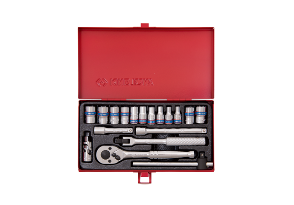 ZESTAW NASADEK 1/4" 18cz. KRÓTKIE, 6/8-kąt. 4 - 12mm Z GRZECHOTKĄ I AKCESORIAMI, KASETA