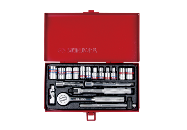 ZESTAW NASADEK CALOWYCH 1/4" 18cz. KRÓTKIE, 6/8-kąt. 5/32 - 1/2" Z GRZECHOTKĄ I AKCESORIAMI, KASETA