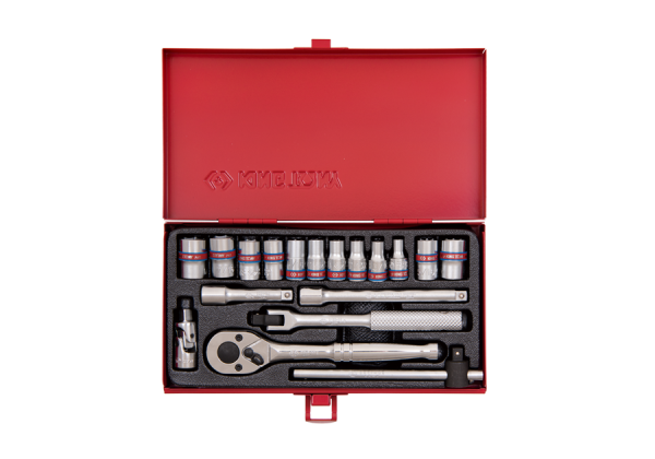 ZESTAW NASADEK CALOWYCH 1/4" 18cz. KRÓTKIE, 6/8-kąt. 5/32 - 1/2" Z GRZECHOTKĄ I AKCESORIAMI, KASETA