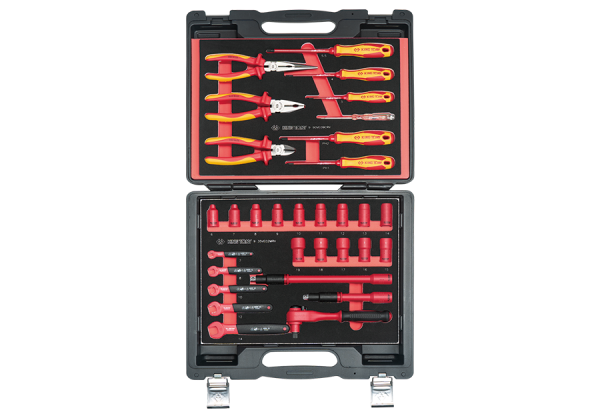 ZESTAW NASADEK IZOLOWANYCH 3/8" 31cz. KRÓTKIE, 6-kąt. 10 - 19mm, Z AKCESORIAMI, CHROM, KASETA Z TWORZYWA
