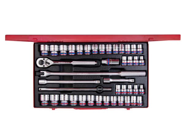 ZESTAW NASADEK METRYCZNYCH I CALOWYCH 1/2" 42cz. KRÓTKIE 12-kąt. 10 - 32mm, 5/16" - 1.1/4" Z GRZECHOTKĄ AKCESORIAMI, KASETA, KAS