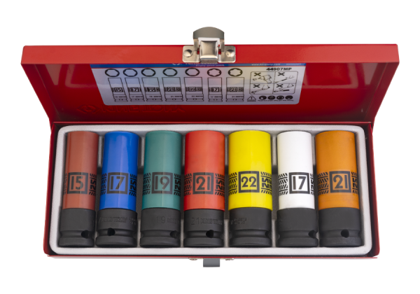 ZESTAW NASADEK UDAROWYCH 1/2" DO FELG ALUMINIOWYCH 7cz. 6-kąt. 15 - 21mm, METALOWA KASETA