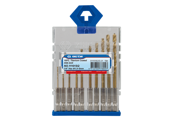 ZESTAW WIERTEŁ 1/4" HSS 1.5mm - 5mm, W POWŁOCE TYTANOWEJ Z UCWYTEM HEX, 10 SZT.
