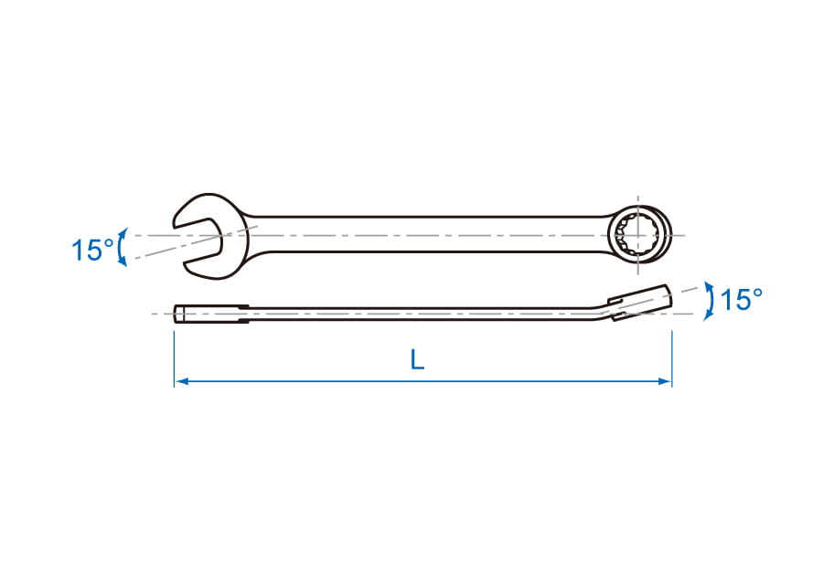 Klucz płasko-oczkowy w rozmiarze 20 mm. Całkowita długość klucza 245 mm. Klucz chromowany. Część oczkowa odchylona o 15 stopni w porównaniu z linią klucza, część płaska pochylona o 15 stopni w odniesieniu do linii klucza.