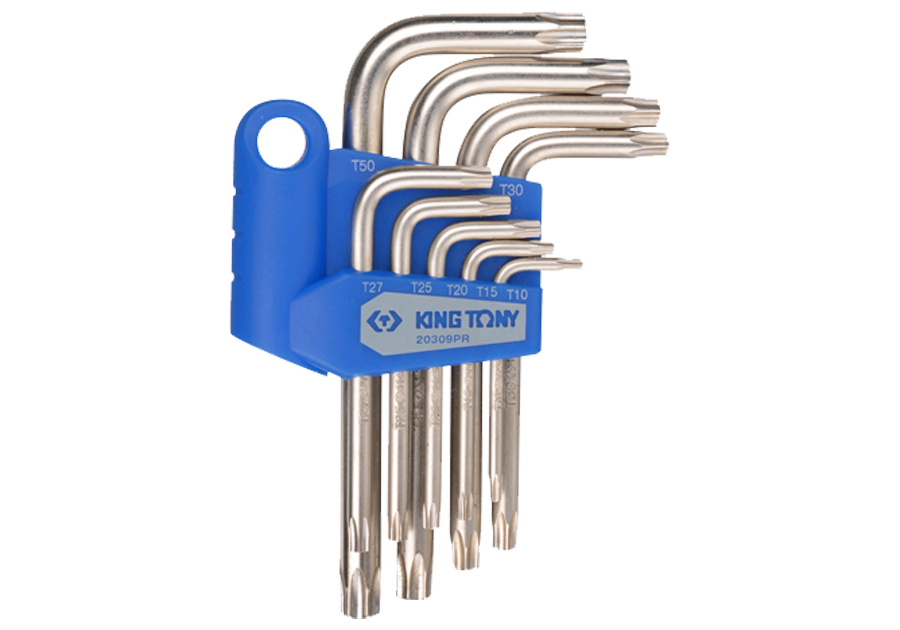 Zestaw kluczy imbusowych w plastikowym uchwycie. W zestawie znajduje się 9 kluczy profesjonalnej marki King Tony o rozmiarach: T10, T15, T20, T25, T27, T30, T40, T45, T50.