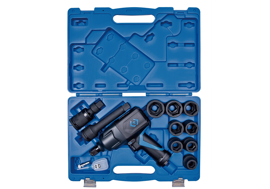 W zestawie: nasadki w rozmiarach 19, 22, 24, 27, 30, 32, 36, 38 mm, klucz udarowy, przedłużka, złączka, adapter wlotu powietrza.