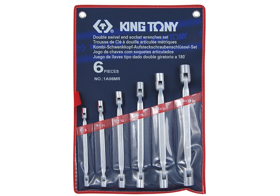 Zestaw profesjonalnych kluczy nasadowych przegubowych firmy King Tony. Zestaw w etui ze wzmacnianymi uchwytami do powieszenia na ścianie warsztatu. W skład zestawu wchodzi 6 kluczy o rozmiarach [ mm ] 8x9, 10x11, 12x13, 14x15, 16x17, 18x19