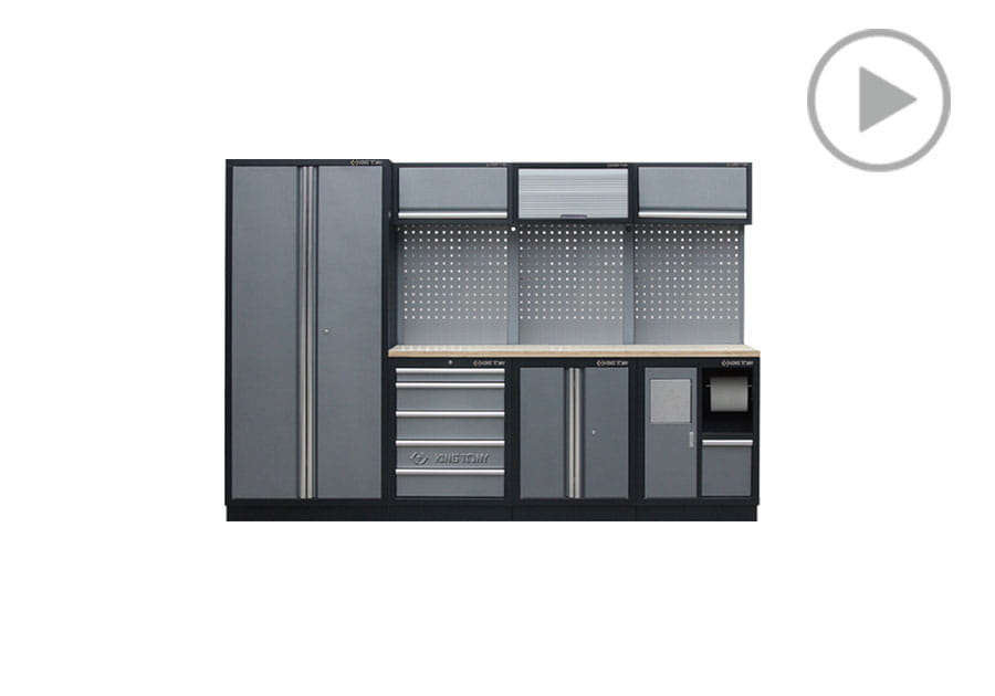 Zestaw mebli warsztatowych King Tony o wymiarach 2955 mm (dł.) x 460 mm (gł.) x 2000 mm (wys.) . W skład zestawu wchodzi 7 szafek metalowych w tym:- 2 szafki wiszące ścienne o wymiarach 680x350x280 mm z drzwiczkami otwieranymi do góry na teleskopach,- 1 szafki wiszące ścienne o wymiarach 680x350x280 mm zamykane roletą,- szafa dwudrzwiowa stojąca o wysokości 2000 mm z zamkiem,- 3 płyt ściennych perforowanych o wymiarach 615x1052x25 mm każda,- szafka podłogowa dwudrzwiowa z zamkiem i półką o wymiarach 680x910x460 mm,- szafka podłogowa z pięcioma szufladami na prowadnicach łożyskowanych z zamkiem centralnym 680x910x460 mm,- szafka podłogowa z miejscem na śmietnik, szufladą i uchwytem na ręcznik papierowy o wymiarach 680x910x460 mm.- blat roboczy laminowany