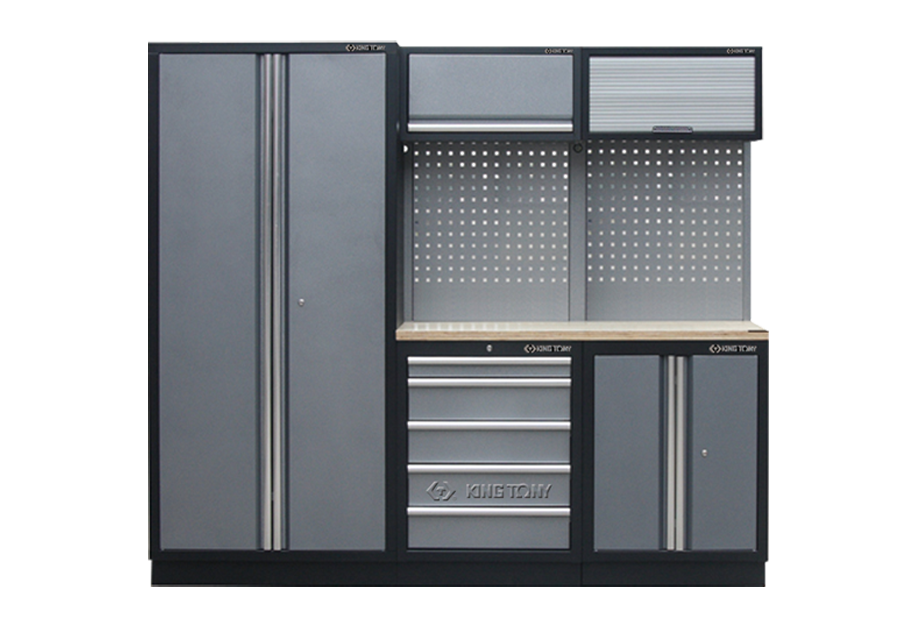 Zestaw mebli warsztatowych King Tony o wymiarach 2275 mm (dł.) x 460 mm (gł.) x 2000 mm (wys.) . W skład zestawu wchodzi 5 szafek metalowych w tym:- szafka wiszące ścienne o wymiarach 680x350x280 mm z drzwiczkami otwieranymi do góry na teleskopach,- szafka wiszące ścienne o wymiarach 680x350x280 mm zamykane roletą,- szafa dwudrzwiowa stojąca o wysokości 2000 mm z zamkiem,- 2 płyt ściennych perforowanych o wymiarach 615x1052x25 mm każda,- szafka podłogowa dwudrzwiowa z zamkiem i półką o wymiarach 680x910x460 mm,- szafka podłogowa z pięcioma szufladami na prowadnicach łożyskowanych z zamkiem centralnym 680x910x460 mm,- blat roboczy laminowany