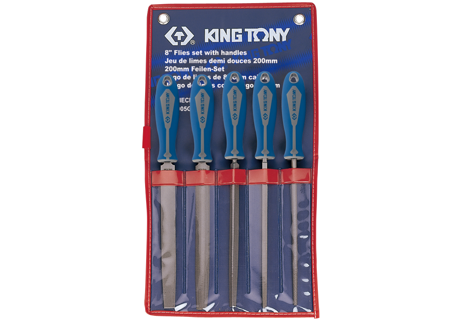 Zestaw pilników do metalu o długości powierzchni piłującej 10 cali (250 mm ) z wygodną rączką. W zestawie znajduje się 5 sztuk pilników, każdy pilnik posiada inny przekrój: prostokąt, półkole, koło, trójkąt oraz kwadrat. Całość pakowana w zgrabne plastikowe etui ze wzmacnianymi uchwytami do powieszenia na ścianie.
