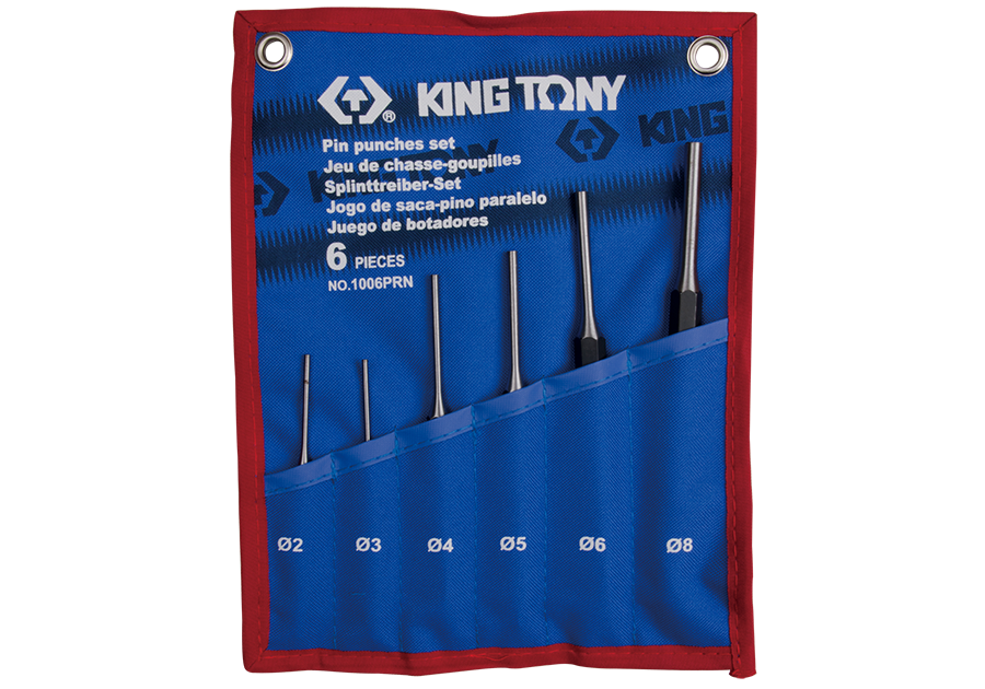 Zestaw wybijaków igłowych 6 sztuk. W skład zestawu wchodzą wybijaki o następujących rozmiarach: 2x30, 3x40, 4x50, 5x55, 6x55, 8x60. Wybijaki wykonane są z wysokiej jakości stali chromowo - wanadowej, a ich powierzchnia została poddana fosforowaniu. Cały zestaw w etui z materiału ze wzmacnianymi uchwytami do powieszenia na ścianie.
