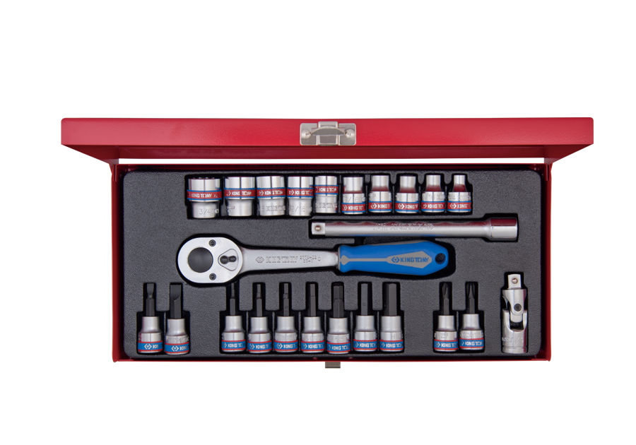 Zestaw narzędzi 3/8" King Tony w metalowej kasecie. W zestawie znajduje się 10 nasadek krótkich 12-kątnych w rozmiarach calowych: 1/4", 5/16", 11/32", 3/8", 7/16", 1/2", 9/16", 5/8", 11/16", 3/4", nasadki z końcówką krzyżakową w rozmiarach 2 i 3, nasadki z końcówką płaską w rozmiarach 5 i 8, nasadki z końcówką HEX w rozmiarach 3,4,5,6,7,8,10 oraz akcesoria: grzechotka z gumową rączką, przedłużka 6 cali i przegub Kardana.