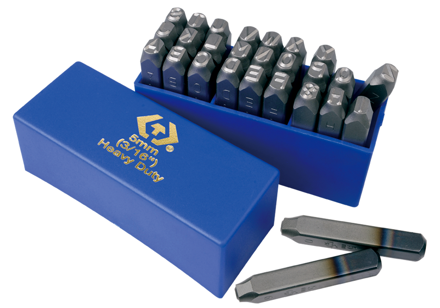 Znaczniki alfabetyczne wzmacniane, 5 mm (A - Z, &) , 11 x 11 mm. Wykonane ze stali chromowo-wanadowa HRC60, po stronie do uderzania HRC40.